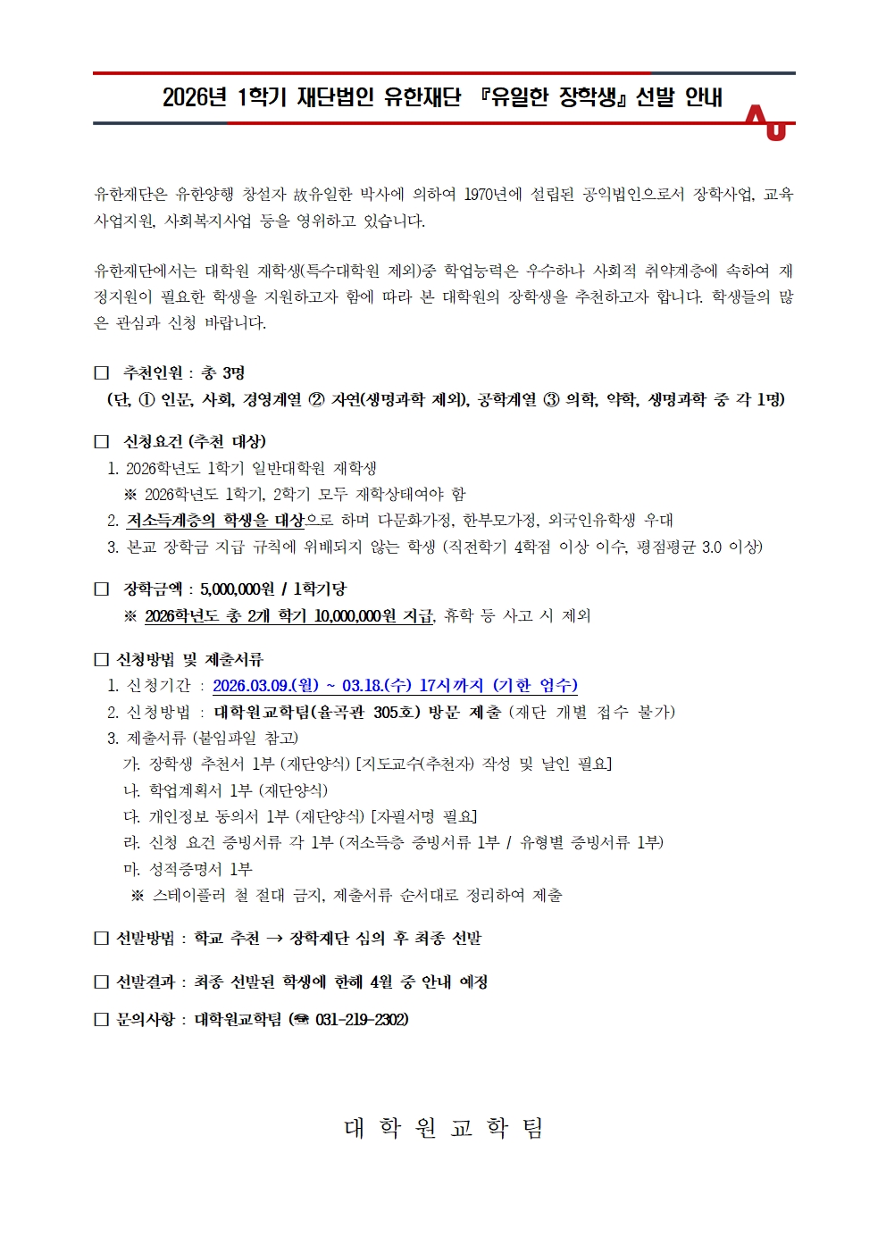 [장학] 2026년 1학기 재단법인 유한재단 『유일한 장학생』선발 안내