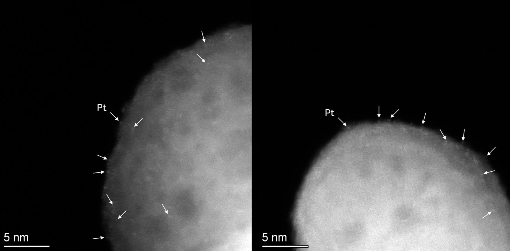 화살표로 표시된 밝은 대비점들은 지지체 표면에 하나씩 고르게 분산된 백금(Pt) 원자들을 나타내며,